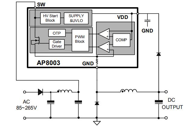 AP8003非隔離交直流轉換芯片集成PFM控制器及500V高可靠性MOSFET,用于外圍元器件極精簡的小功率非隔離開關電源。AP8003內置500V高壓啟動,實現系統快速啟動、超低待機功能。該芯片提供了完整的智能化保護功能,包括過載保護,欠壓保護,過溫保護。另外AP8003非隔離交直流轉換芯片具有優異的EMI特性。