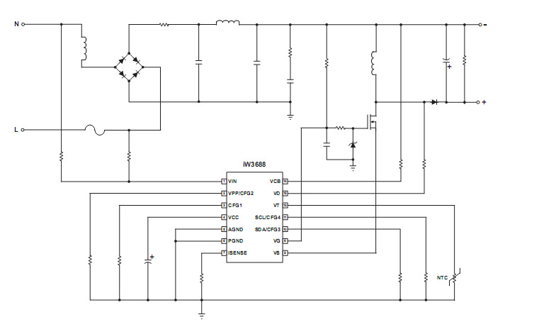 IW3688支持Buck-Boost(非隔離方案)或flyback拓撲結構(隔離方案),支持無調光器,前切,后切調光器,無調光器時高功率因數(PF>0.9)以及低THD<20%,大多數調光器可支持1%到100%的寬調光范圍。無需專門的bleeder或啟動電路,也無需輔助繞組,很簡化的外圍電路,只需要一個高壓功率MOSFET,可使用非常廉價的單繞組電感。
