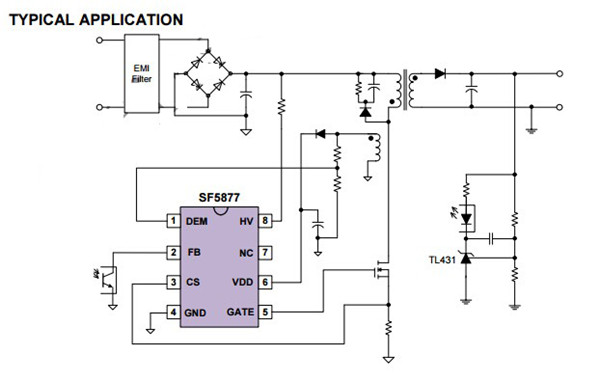 SF5877是多模式控制器。當滿負荷,該IC在CCM模式或QR模式的基礎上AC線路輸入的工作。當負載變低時,IC進入“數字頻率折返”的模式,以提高功率轉換效率。當輸出功率是非常小的,IC進入到突發模式,可以實現小于100mW的空載功率。