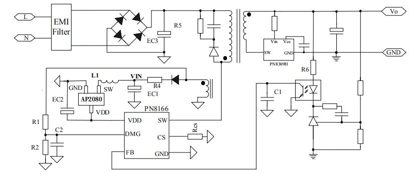 AP2080低成本輔助供電升壓芯片典型應用于65W快充方案PN8213+PN8307P+AP2080,AP2080 Boost芯片支持寬供電輸出,使用兆赫茲開關頻率的COT控制技術,將儲能電感體積降至0805封裝,任何工況下PN8165供電范圍控制在11~35V,顯著提升15~20V輸出電壓下的轉換效率。