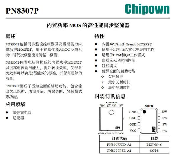 同步整流芯片PN8307P:PN8307P內置100V/7mΩ智能MOSFET,快速關斷+自適應死區控制提高MOSFET Rdson利用率,顯著降低溫升,專利輕載模式可降低待機功耗,具有超高性價比。