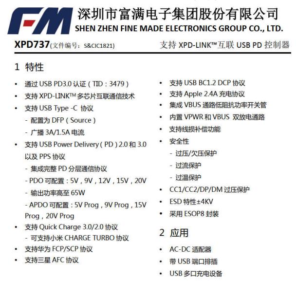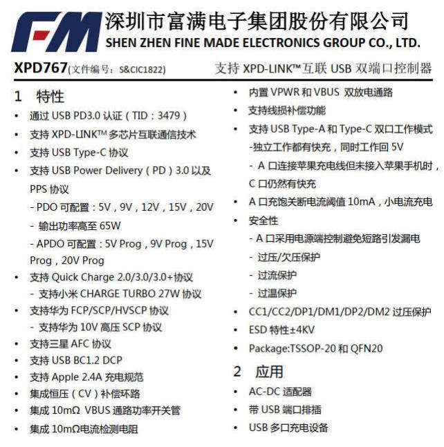 PD協議芯片XPD767:XPD767集成了協議控制和VBUS開關以及復雜的控制邏輯,一顆芯片完成1A1C控制,通過XPD-LINK互聯技術,兩顆芯片即可組成2A1C的快充解決方案,并且無需添加復雜的外圍電路。