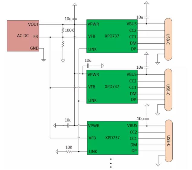 XPD737多口控制器系列采用ESOP8封裝,內部集成 10mΩ VBUS 通路管,并且集成10mΩ電流檢測電阻,支持完善的保護功能,具有XPD-LINK功能,XPD-LINK互聯技術讓芯片之間通過單線總線傳輸信息,從而可以簡單靈活的組合成多個Type-C和Type-A端口的充電方案,降低外圍元件數量,簡化電路,降低成本。