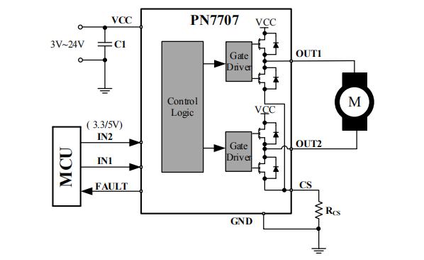PN7707 是一款具有低功耗睡眠模式的兩通道直流馬達驅動芯片,其可以控制馬達進入正轉、反轉、剎車、滑行和超低功耗睡眠模式。該芯片集成了驅動限流功能且外部可調、欠壓保護、過溫保護和輸出短路保護等功能。