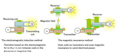 磁場共振:由能量發送裝置,和能量接收裝置組成,當兩個裝置調整到相同頻率,或者說在一個特定的頻率上共振,它們就可以交換彼此的能量,是目前正在研究的一種技術,該實驗中使用的線圈直徑達到50cm,還無法實現商用化,如果要縮小線圈尺寸,接收功率自然也會下降。