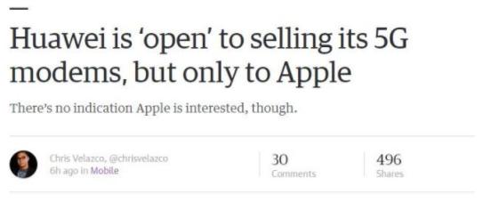 近日據Engadget報道,華為將向蘋果出售5G芯片,且僅限于Apple。消息一出,市場上議論紛紛,華為表示不予置評。