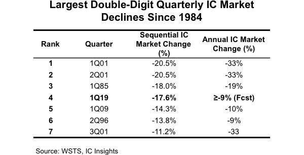 更悲觀的是,自1984年以來,按照以往的發展脈絡來看,一般芯片行業第一季度跌幅超過10%的話,那么,全年都會下跌至少9%,IC Insights認為今年也不會例外,第一季度是傳統淡季,過去36年來芯片行業平均下跌2.1%,但今年形勢格外嚴峻,也就是說,今年全年對于全球半導體來說,或許都是出于低谷的,下跌的概率相當大。