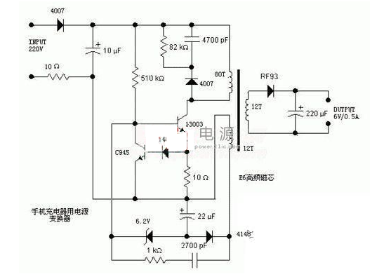 而下方的1KΩ電阻跟串聯的2700pF電容,則是正反饋支路,從取樣繞組中取出感應電壓,加到開關管的基極上,以維持振蕩。右邊的次級繞組就沒有太多好說的了,經二極管RF93整流,220uF電容濾波后輸出6V的電壓。沒找到二極管RF93的資料,估計是一個快速回復管,例如肖特基二極管等,因為開關電源的工作頻率較高,所以需要工作頻率的二極管。這里可以用常見1N5816、1N5817等肖特基二極管代替。
